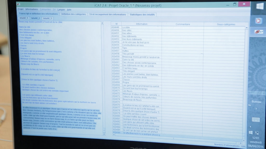 Au total, des centaines d’informations sont produites, plus de 1300 en ce qui concerne cet objet mystère. Grand moment de solitude, une fois les transcriptions finies. J’ai devant moi les petites pièces d’un immense puzzle, en tas. Des contours vont émerger au fur et à mesure que je progresse. Nous définissons avec Alexis Champion les catégories dans lesquelles seront classées les informations, en l’occurrence les caractéristiques physiques de l’objet, ses usages, le contexte culturel dans lequel il est utilisé, la localisation. Un logiciel conçu par IRIS (rappelons qu’Alexis est informaticien, et docteur en intelligence artificielle) permet de procéder à un premier tri, qu’il faut ensuite affiner. Chaque perception est classée, croisée avec d’autres qui lui ressemblent.