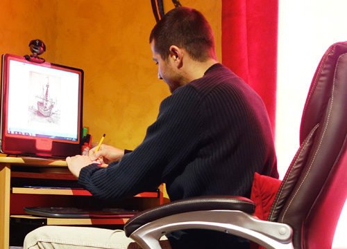 Au moment où nous discutons à Nice autour du cruchon, je suis uniquement là pour filmer les événements, tel un documentariste. Mais le destin me tend encore sa main amicale, et je n’ai qu’à la saisir : « j’aimerais la dessiner, cette histoire ». Au fond de moi, je sais bien que je suis là pour ça. Alexis le pressentait-il dès le début de l’aventure ? Ça ne m’étonnerait pas de lui. Une fois la proposition acceptée, il faut se montrer à la hauteur des attentes. Comment traiter cette masse de données éparses sur le cruchon ? Plusieurs époques, propriétaires, lieux et fonctions, sont décrits : de quoi donner le vertige. Des informations d’une extraordinaire précision émergent et dans le même temps, un flou artistique demeure : à quelles dates se référer ? Quelles villes représenter ? Quelles physionomies privilégier ? Car il s’agit bien de choisir, parmi cette foule de propriétaires successifs sortis de la brume des siècles. Potiers, marchands, apothicaires, moines, marins, bourgeois… autant de personnages possibles.