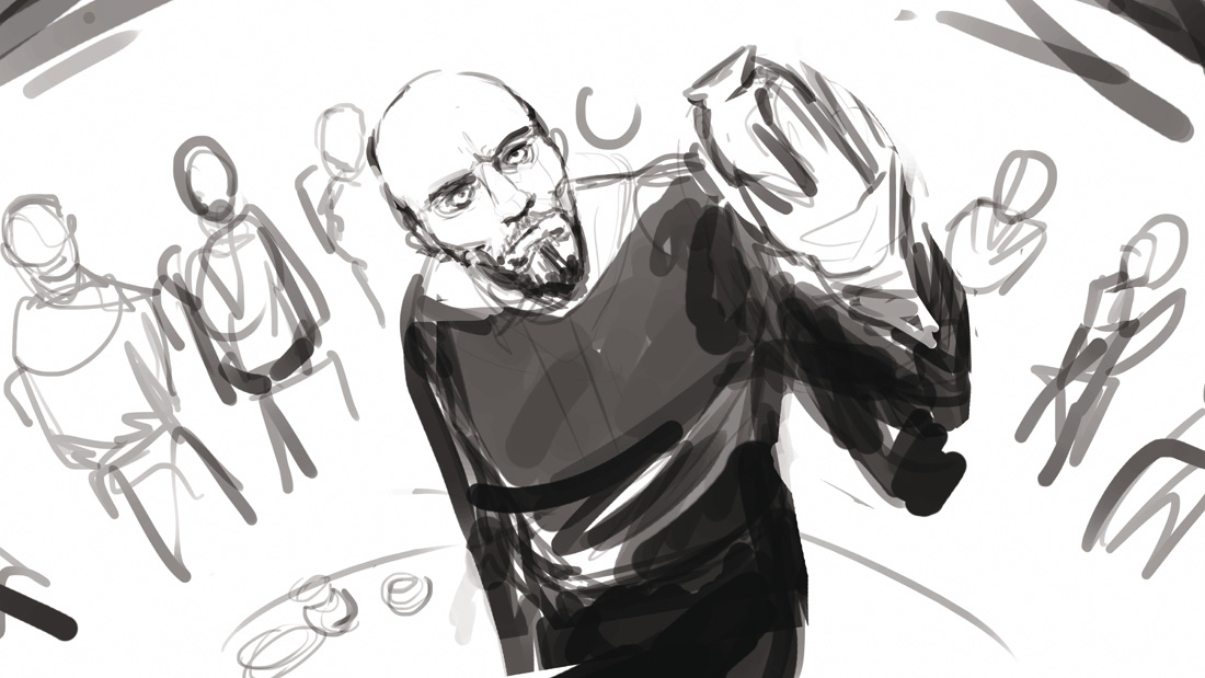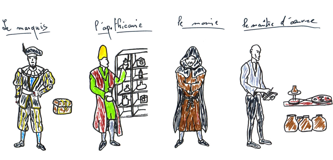 Raconter une série d’informations en une seule image, dont la lecture soit claire et limpide, est un vrai exercice de narration. Il faut penser sa composition comme un tableau tout en gardant à l’esprit que les cases seraient petites, comme une bande dessinée. Chaque scène étant potentiellement une époque en soit, j’ai décidé qu’elles se distingueraient par leur teinte chromatique. Mais quels visages donner aux personnages ? L’apothicaire est décrit comme ayant des traits fins et allongés, le commanditaire comme étant maigre et dégarni, le « moine » comme un homme à la fine barbe et aux traits osseux avec des yeux puissants : autant de mots évocateurs qui m’inspirent. Ma propre intuition fait le reste. Cette capacité joue une grande place dans le dessin. Quand un trait est juste, on le sent plus qu’on ne saurait l’expliquer.
