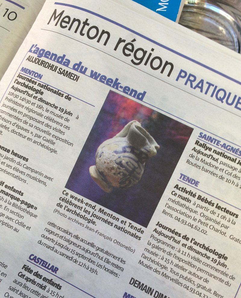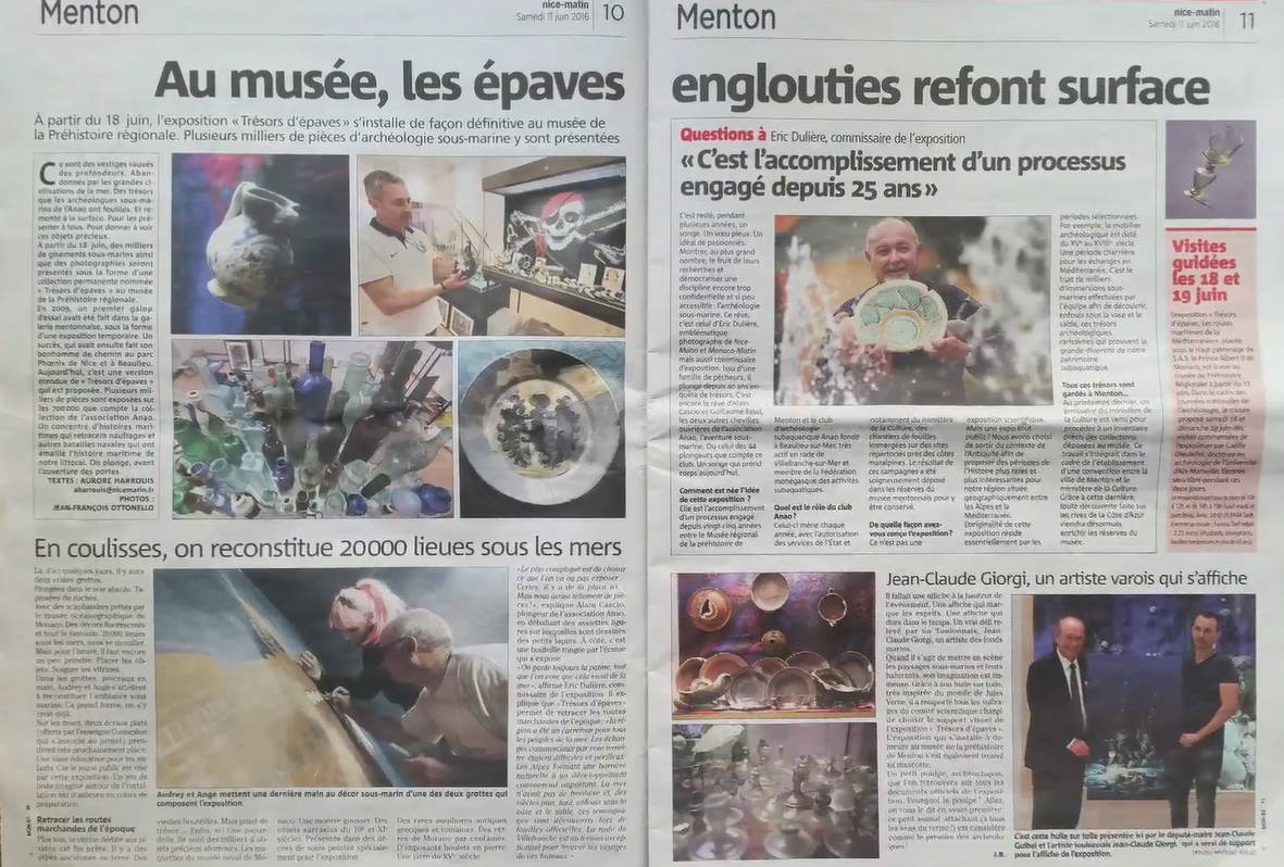Le 17 juin 2016, Anao a inauguré l’exposition permanente Trésors d’Épaves dédiée aux routes maritimes méditerranéennes (poteries de toute la Méditerranée du Moyen Âge à la fin du 18ème siècle), au Musée de préhistoire régionale de Menton. Une superbe mise en lumière d’un travail de collecte qui en vingt ans, a permis de sauver des eaux des dizaines de milliers d’artefacts.